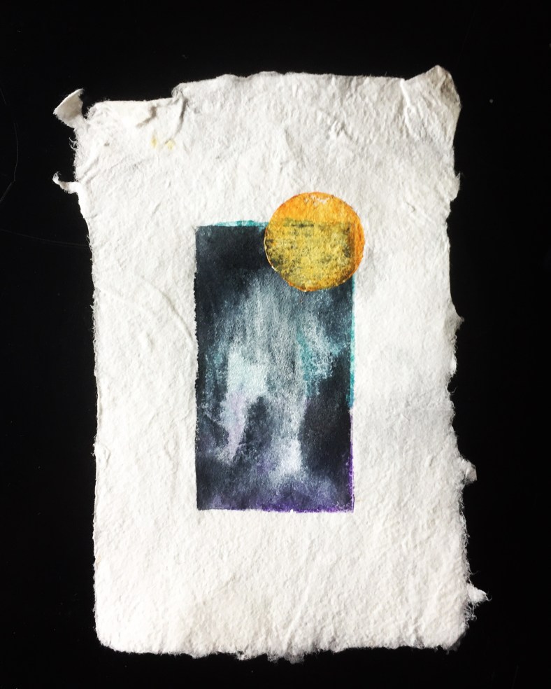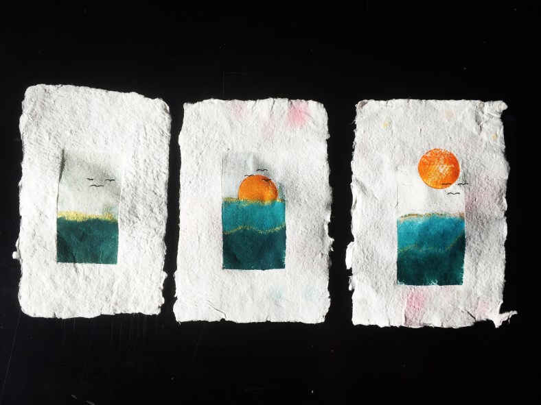 Voor een project papier ben ik druk bezig om kleine werkjes te maken op eigen geschept papier. Hier onder een aantal voorbeelden.
